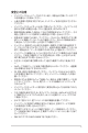 通知 FCC(米国連邦通信委員会)規定の適合宣言 本装置は米国連邦通信委員会(FCC)規定第 15 部に準拠しています。本装置 の操作は以下の 2 つの条件を前提としています: • • 本装置は有害な電波障害を引き起こすとは限らないこと。 本装置は、誤動作を引き起こしうる電波障害を含め、いかなる電波障害も 容認しなければならないこと。 本装置は、FCC 規定第 15 部によるクラス B デジタル装置の規制に準拠する ことが試験により確認されています。これらの規制は、住居に設置した場合の 有害な電波障害に対する適正な保護を提供することを目的としたものです。 本装置は無線周波エネルギーを生成、使用し、放射しうるため、説明書の記載 どおりに設置、使用しない場合には、無線通信に有害な電波障害を引き起こ す可能性があります。ただし、特定の設置方法において電波障害が発生しな いという保証はありません。本装置の電源のオン / オフを切り替えることによ り、本装置が無線またはテレビの受信に有害な電波障害を引き起こしている ことが確認された場合は、電波障害を修正するために次の対処方法のうちい くつかをお試しください: