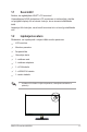 1.1 Sveicināti! Paldies, ka iegādājāties ASUS® LCD monitoru! Visjaunākajam ASUS platekrāna LCD monitoram ir izteiksmīgās, platāks un spilgtāks displejs, kā arī daudz funkciju, kuras izmantot skatīšanās laikā. Izmantojot šīs funkcijas, varat baudīt monitora ērto un burvīgo skatīšanās vidi! 1.2 Iepakojuma saturs Pārbaudiet, vai iepakojumā ir iekļauti tālāk minētie piederumi.