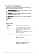 Conventions used in this guide To make sure that you perform certain tasks properly, take note of the following symbols used throughout this manual. D A N G E R / W A R N I N G : Information to prevent injury to yourself when trying to complete a task. C A U T I O N : Information to prevent damage to the components when trying to complete a task. I M P O R T A N T : Instructions that you MUST follow to complete a task. N O T E : Tips and additional information to help you complete a task.