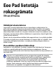 Iepakojuma saturs Latviski Eee Pad USB lādētājs Strāvas kontaktdakša Dokstacijas konektors USB kabelim nual User Ma Lietotāja rokasgrāmata Garantijas karte • Ja kāda no šīm lietām ir bojāta vai trūkst, sazinieties ar tālākpārdevēju. • Eee Pad komplektā ietvertā strāvas kontaktdakša var atšķirties atkarībā no atrašanās vietas, lai pielāgotu to konkrētās valsts sienas kontaktrozetei.