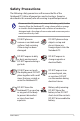 Safety Precautions The following safety precautions will increase the life of the Notebook PC. Follow all precautions and instructions. Except as described in this manual, refer all servicing to qualified personnel. Disconnect the AC power and remove the battery pack(s) before cleaning. Wipe the Notebook PC using a clean cellulose sponge or chamois cloth dampened with a solution of nonabrasive detergent and a few drops of warm water and remove any extra moisture with a dry cloth.