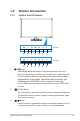 1.5 Monitor introduction 1.5.1 Front of the LCD monitor VE278H 1 2 4 5 6 7 8 VE278N 1 1. 2 3 5 6 7 8 Button: • Automatically adjust the image to its optimized position, clock, and phase by long pressing this button for 2-4 seconds (for VGA mode only). • Use this hotkey to switch from six video preset modes (Scenery Mode, Standard Mode, Theater Mode, Game Mode, Night View Mode, and sRGB Mode) with SPLENDID™ Video Intelligence Technology.