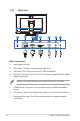1.3.2 Back view 1 2 3 4 5 6 7 Rear connectors 1. Kensington lock slot. 2. AC-IN port: This port connects the power cord. 3. VGA port: This 15-pin port is for PC VGA connection. 4. DVI port: This 24-pin port is for PC (Personal Computer) DVI-D digital signal connection. Only DVI port supports 3D feature given NVIDIA 3D Vision Kit is available 1-4 5. HDMI-IN port: This port is for connection with an HDMI compatible device. 6. PC Audio-In Jack: This 3.