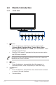 1.3 Monitor introduction 1.3.1 Front view 1 1. 2 3 4 5 6 7 Button: • Press this hotkey to switch from six video preset modes (Scenery Mode, Standard Mode, Theater Mode, Game Mode, Night View Mode, and sRGB ) with SPLENDID™ Video Intelligence Technology. • Exits the OSD menu or goes back to the previous menu when the OSD menu is active. The Splendid, Contrast and Brightness adjustment functions will be temporarily disabled while 3D function is activated. 2.
