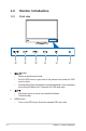 1.3 Monitor introduction 1.3.1 Front view 1 1. 2 3 4 5 6 button: • Selects a desired preset mode. • Exits the OSD menu or goes back to the previous menu when the OSD menu is active. • Automatically adjusts the image to its optimized position, clock, and phase by touching this button for 2-4 seconds (for VGA mode only). • Decreases values or moves your selection left/down. • Contrast hotkey 2. 3. MENU button: • 1-2 Turns on the OSD menu. Enacts the selected OSD menu item.