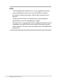 IMPORTANT! • It is recommended that you install or upgrade the memory modules, wireless card, and solid state drive (SSD) under professional supervision. Visit an ASUS service center for further assistance. • Ensure that your hands are dry before proceeding with the rest of the installation process. Before installing any of the features in this guide, use a grounded wrist strap or touch a safely grounded object or metal object to avoid damaging them due to static electricity.