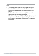 IMPORTANT! • It is recommended that you install or upgrade the memory modules, wireless card, and solid state drive (SSD) under professional supervision. Visit an ASUS service center for further assistance. • Ensure that your hands are dry before proceeding with the rest of the installation process. Before installing any of the features in this guide, use a grounded wrist strap or touch a safely grounded object or metal object to avoid damaging them due to static electricity.