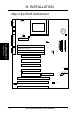 III. INSTALLATION CPU ZIF Socket 8 COM 1 JP1 JP2 JP3 JP4 Map of the ASUS Motherboard #CR2032 3Volt Button Cell Battery PS/2 Keyboard PS/2 Mouse CPU Voltage ID JP7 JP6 Parallel Printer Battery Test Lead 12V Fan Power Reg/ATX 3.3V Board Power Input for ATX Power Supply JP8 JP9 SIMM Socket 3 (Bank 1) SIMM Socket 2 (Bank 0) JP10 JP11 JP12 JP13 SIMM Socket 1 (Bank 0) Primary IDE COM 2 SIMM Socket 4 (Bank 1) Secondary IDE III. INSTALLATION (Map of Board) Floppy Drives BUS Freq. Freq.