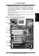 II. FEATURES Features of the ASUS Motherboard The ASUS P/I-XP6NP5 is carefully designed for the demanding PC user who wants a great many features in a small package. This motherboard: II. FEATURES (Features) 2 • Easy Installation: Is equipped with BIOS that supports auto detection of hard drives, PS/2 mouse, and Plug and Play devices to make setup of hard drives, expansion cards, and other devices virtually automatic. • Multi-Speed Support: Supports one 150-200MHz Pentium Pro CPU on a ZIF Socket 8.