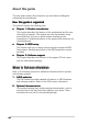 About this guide This user guide contains the information you need when installing and configuring the motherboard. How this guide is organized This manual contains the following parts: • Chapter 1: Product introduction This chapter describes the features of the motherboard and the new technology it supports. This chapter also lists the hardware setup procedures that you have to perform when installing system components. It includes description of the jumpers and connectors on the motherboard.