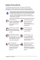 Safety Precautions The following safety precautions will increase the life of the Notebook PC. Follow all precautions and instructions. Except as described in this manual, refer all servicing to qualified personnel. Disconnect the AC power and remove the battery pack(s) before cleaning. Wipe the Notebook PC using a clean cellulose sponge or chamois cloth dampened with a solution of nonabrasive detergent and a few drops of warm water and remove any extra moisture with a dry cloth.