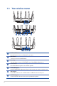 WAN (Internet) port Connect a network cable into this port to establish WAN connection. LAN ports Connect network cables into these ports to establish LAN connection. Reset button This button resets or restores the system to its factory default settings. Power LED Off: No power. On: Device is ready. Flashing slow: Rescue mode. 2.4GHz / 5GHz Wi-Fi LED Off: No 2.4GHz / 5GHz signal. On: Wireless system is ready. Flashing: Transmitting or receiving data via wireless connection.
