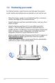 1.4 Positioning your router For the best wireless signal transmission between the wireless router and the network devices connected to it, ensure that you: • Place the wireless router in a centralized area for a maximum wireless coverage for the network devices. • Keep the device away from metal obstructions and away from direct sunlight. • Keep the device away from 802.11g or 20MHz only Wi-Fi devices, 2.