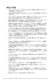通知 FCC(米国連邦通信委員会)規定の適合宣言 本装置は米国連邦通信委員会(FCC)規定第 15 部に準拠しています。本装置 の操作は以下の 2 つの条件を前提としています: • • 本装置は有害な電波障害を引き起こしてはならない。 本装置は、誤動作を引き起こしうる電波障害を含め、いかなる電波障害も 容認しなければならないこと。 本装置は、FCC 規定第 15 部によるクラス B デジタル装置の規制に準拠する ことが試験により確認されています。 これらの規制は、住居に設置した場合の 有害な電波障害に対する適正な保護を提供することを目的としたものです。 この機材は高周波エネルギーを生成し、利用します。 また、高周波エネルギー を放射することがあります。指示に従わずに取り付け、使用した場合、無線通 信を妨害する可能性があります。ただし、特定の設置方法において電波障害 が発生しないという保証はありません。本装置の電源のオン / オフを切り替え ることにより、本装置が無線またはテレビの受信に有害な電波障害を引き起 こしていることが確認された場合は、電波障害を修正するために次の対処方 法のうちいくつかをお試し