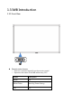 1.3.4 AC-IN & VESA mount grid POWER switch Press the switch to turn on/off power AC-IN port This port connects the power cord (power source requirement:100-240V~50/60Hz 2.5A ) VESA mount Mount this IWB by wall mount, ceiling mount, table stand, etc. For the wall-counting kit, use M6 mounting screws (having a length 20 mm longer than the thickness of the mounting bracket) and tighten them securely.