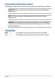 About this manual This manual provides information about the hardware and software features of your ASUS Tablet, organized through the following chapters: Chapter 1: Hardware Setup This chapter details the hardware components of your ASUS Tablet. Chapter 2: Using your ASUS Tablet This chapter shows you how to use the different parts of your ASUS Tablet. Chapter 3: Working with Android™ This chapter provides an overview of using Android™ in your ASUS Tablet.