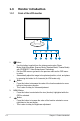 1.3 Monitor introduction 1.3.1 Front of the LCD monitor 1 1. • • • 2. 3. 4. • • 3 4 5 6 Button: Use this hotkey to switch from five video preset modes (Game Mode, Night View Mode, Scenery Mode, Standard Mode, Theater Mode) with SPLENDID™ Video Enhancement Technology. Exit the OSD menu or go back to the previous menu as the OSD menu is active. Automatically adjust the image to its optimized position, clock, and phase by pressing this button for 2-4 seconds (for VGA mode only).