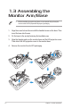 1.3 Assembling the Monitor Arm/Base •• 1-2 While assembling the monitor arm/base, we recommend that you keep the monitor inside its EPS (Expanded Polystyrene) packaging. 1. Align the screw hole on the arm with the bundled screw on the base. Then insert the base into the arm. 2. Fix the base to the arm by fastening the bundled screw. 3. Align the triangle marks on the monitor base and the LED projection cover. Then attach the LED projection cover to the monitor base. 4.