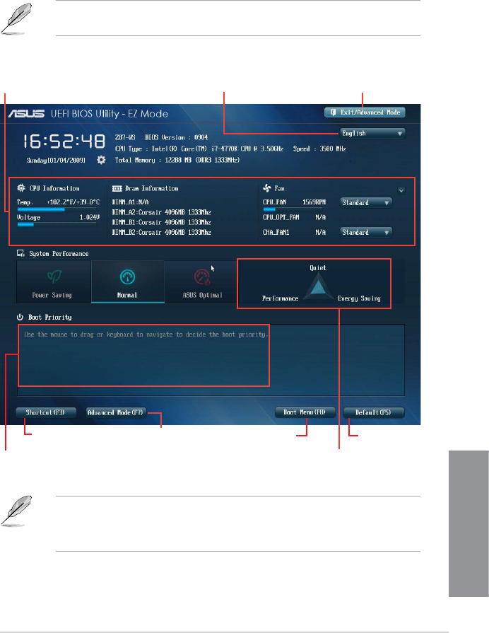 By default, the EZ Mode screen appears when you enter the BIOS setup program. The EZ
