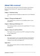 Table of Contents About this manual......................................................................................................7 Conventions used in this manual.............................................................................. 8 Icons..................................................................................................................................... 8 Typography..............................................................................................................