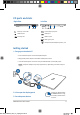 I/O ports and slots Right Side Left Side Memory card reader Power (DC) input port USB 2.0 port HDMI port Security slot USB 3.0 port USB Type-C port Headphone/Headset/Microphone jack Getting started 1. Charge your Notebook PC A. Connect the AC power cord to the AC/DC adapter. B. Plug the AC power adapter into a 100V~240V power source. C. Connect the DC power connector into your Notebook PC’s power (DC) input. NOTE: The power adapter may vary in appearance, depending on models and your region. 2.