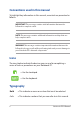 Conventions used in this manual To highlight key information in this manual, some text are presented as follows: IMPORTANT! This message contains vital information that must be followed to complete a task. NOTE: This message contains additional information and tips that can help complete tasks. WARNING! This message contains important information that must be followed to keep you safe while performing tasks and prevent damage to your Notebook PC's data and components.