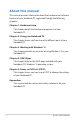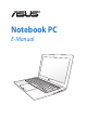 About this manual This manual provides information about the hardware and software features of your Notebook PC, organized through the following chapters: Chapter 1: Hardware Setup This chapter details the hardware components of your Notebook PC. Chapter 2: Using your Notebook PC This chapter shows you how to use the diferent parts of your Notebook PC. Chapter 3: Working with Windows® 8 This chapter provides an overview of using Windows® 8 in your Notebook PC.