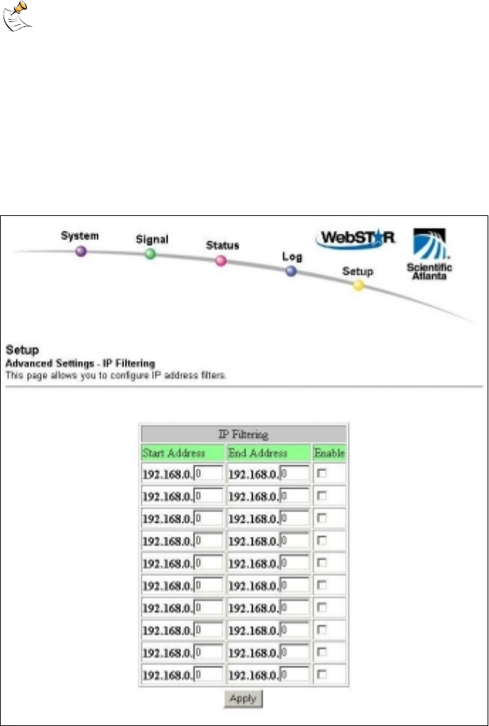 Use the Setup Advanced Settings – IP Filtering page to configure IP address