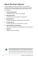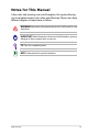 About This User’s Manual You are reading the Eee PC User’s Manual. This User’s Manual provides information regarding the various components in the Eee PC and how to use them. The following are major sections of this User’s Manual: 1. Introducing the Eee PC Introduces the Eee PC and this User’s Manual. 2. Knowing the Parts Provides information on the Eee PC’s components. 3. Getting Started Provides information on getting started with the Eee PC. 4.