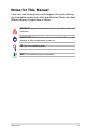 About This User’s Manual You are reading the Eee PC User’s Manual. This User’s Manual provides information regarding the various components in the Eee PC and how to use them. The following are major sections of this User’s Manual: 1. Introducing the Eee PC Introduces the Eee PC and this User’s Manual. 2. Knowing the Parts Provides information on the Eee PC’s components. 3. Getting Started Provides information on getting started with the Eee PC. 4.