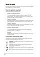 About this guide This user guide contains the information you need to install and configure your ASUS WiFi-g™ wireless solution. How this guide is organized This guide contains the following parts: • Chapter 1: Product introduction This chapter describes the general features of the ASUS WiFi-g™ wireless solution. The chapter also presents the LED indications, and recommended WiFi-g™ network settings.
