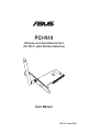 PCI-N10 WLAN Card User Manual Manufacturer: ASUSTeK Computer Inc. Tel: Authorised representative in Europe: Authorised distributors in Turkey: +886-2-2894-3447 Address: No. 150, LI-DE RD., PEITOU, TAIPEI 112, TAIWAN ASUS Computer GmbH Address: HARKORT STR. 21-23, D-40880 RATINGEN, DEUTSCHLAND BOGAZICI BIL GISAYAR SAN. VE TIC. A.S. Tel: +90 212 3311000 Address: AYAZAGA MAH. KEMERBURGAZ CAD. NO.10 AYAZAGA/ISTANBUL INDEX BILGISAYAR SISTEMLERI MUHENDISLIK SAN. VE TIC. A.S.