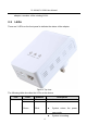 PL-X31M,PL-X32M User Manual LED Color Behavior Description System is in the process of security setup. Ethernet - Off Power is off. Green On The device is connecting to other devices via the Ethernet interface but not communicating with them. Green Blink The device is receiving or transmitting data via the Ethernet interface. - Off The device is not connecting to other devices via the Ethernet interface. Green/Red On The device has connected to the power line network.