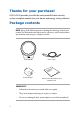 Thanks for your purchase! ASUS HG100 provides you with the most powerful home security system, complete control over your home, and energy saving solutions. Package contents NOTE: If any of the following items is damaged or missing, contact your retailer. The illustrated items below are for reference only. Actual product specifications may vary per country or model.