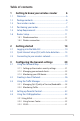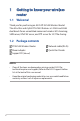 Table of contents 1 1.1 1.2 1.3 1.4 1.5 1.6 Getting to know your wireless router 6 Welcome!.........................................................................................6 Package contents..........................................................................6 Your wireless router......................................................................7 Positioning your router...............................................................9 Setup Requirements....................................
