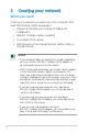 2 Creating your network What you need To set up your network, you need one or two computers that meet the following system requirements: • Ethernet RJ-45 (LAN) port (10Base-T/100Base-TX/ 1000BaseTX) • IEEE 802.11a/b/g/n wireless capability • An installed TCP/IP service • Web browser such as Internet Explorer, Firefox, Safari, or Google Chrome NOTES: • If your computer does not have built-in wireless capabilities, you may install an IEEE 802.