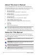 About This User’s Manual You are reading the Eee PC User’s Manual. This User’s Manual provides information regarding the various components in the Eee PC and how to use them. The following are major sections of this User’s Manual: 1. Knowing the Parts Provides information on the Eee PC’s components. 2. Getting Started Provides information on getting started with the Eee PC. 3. Using the Eee PC Provides information on using the Eee PC’s utilities. 4.