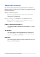 About this manual This manual provides information about the hardware and software features of your ASUS Tablet and ASUS Mobile Dock, organized through the following chapters: Chapter 1: Hardware Setup This chapter details the hardware components of your ASUS Tablet and ASUS Mobile Dock. Chapter 2: Using your ASUS Tablet and ASUS Mobile Dock This chapter shows you how to use the different parts of your ASUS Tablet and its ASUS Mobile Dock. Chapter 3: Working with Windows® 8.