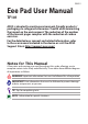 Copyright Information No part of this manual, including the products and software described in it, may be reproduced, transmitted, transcribed, stored in a retrieval system, or tranPadd into any language in any form or by any means, except documentation kept by the purchaser for backup purposes, without the express written permission of ASUSTeK COMPUTER INC. (“ASUS”). ASUS and Eee Pad logo are trademarks of ASUSTek Computer Inc. Information in this document is subject to change without notice.