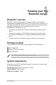 1 Knowing your Tiny Bluetooth dongle Bluetooth® overview Bluetooth® is a short-range wireless technology that allows communication among Bluetooth-enabled devices such as PCs, mobile devices, headsets, and GPS receivers. Bluetooth® devices only need to be within the specified range to exchange information and do not need any physical connection. With Bluetooth® technology, you can: • • • • Connect your computer to the Internet using a Bluetooth-enabled mobile phone.