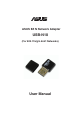 LED status indicators The LED indicator on the ASUS 802.11n Network Adapter indicates the status of the network adapter. Status indicators LED ON Blinking OFF 6 ASUS USB-N10 Indication The ASUS 802.11n Network Adapter is connected to a wireless device. Transmitting data via the ASUS 802.11n Network Adapter. The blinking speed indicates the link speed. The ASUS 802.11n Network Adapter is not connected to a wireless device.