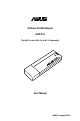 Chapter 1 - Introduction Chapter 1 Introduction 1. Introduction Package contents Check the following items in your ASUS Wireless LAN Adapter package. Contact your retailer if any item is damaged or missing. 1 x ASUS Wireless LAN Adapter (USB-N13) 1 x Support CD 1 x Quick Start Guide 1 x Warranty Card Features High speed networking (11n Draft) for fast download, file transfer, and media streaming EZ WPS setup: Press button on adapter and router for WiFi setup.