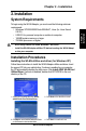 Chapter 2 - Installation 2. Installation System Requirements • ASUS utility cannot run under Windows 7 and Linux. • Install the WLAN Adapter utilities CD before inserting the WLAN Adapt er into your computer. Chapter 2 Installation To begin using the WLAN Adapter, you must meet the following minimum requirements: • Windows XP/2000/2003/Vista 32/64bit/7, Linux (for Linux Kernel 2.6.29) • USB 2.