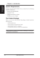 Chapter 1 - Introduction Chapter 1 Requirements System Requirements To begin using the ASUS WLAN Card, you must have the following minimum requirements: • • • • Windows XP/2000/ME/98SE Standard PCI Slot 32MB system memory or larger 300MHz processor or higher The Product Package When you receive the ASUS WLAN Card package, it should contain the following items: • • • • ASUS WLAN Card ASUS WLAN Card Quick Start Guide ASUS WLAN Card User’s Manual CD-ROM Disc (Drivers, Utilities, Documentation) If any of t