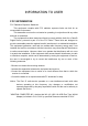 INFORMATION TO USER FCC INFORMATION FCC Radiation Exposure Statement This equipment complies with FCC radiation exposure limits set forth for an uncontrolled environment. This transmitter must not be co-located or operating in conjunction with any other antenna or transmitter. The equipment has been tested and found to comply with the limits for a Class B Digital Device, pursuant to part 15 of the FCC Rules.