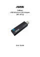About this guide This user guide contains the information you need to install and configure your ASUS USB Wireless LAN Adapter. How this guide is organized This guide contains the following parts: • Chapter 1: Product introduction This chapter describes the physical features of the ASUS USB Wireless LAN Adapter. This part also presents the package contents, LED indicators, and recommended network settings.