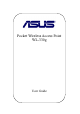 About this guide This user guide contains the information you need to install and configure your ASUS Pocket Wireless Access Point (AP). How this guide is organized This guide contains the following parts: • Chapter 1: Product introduction This chapter describes the physical features of the ASUS Pocket Wireless AP. It also presents the package contents, LED indicators, and recommended network settings.