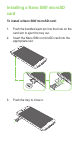 Installing a Nano SIM/ microSD card To install a Nano SIM/ microSD card: 1. Push the bundled eject pin into the hole on the card slot to eject the tray out. 2. Insert the Nano SIM or microSD card into the appropriate slot. 3. Push the tray to close it.