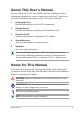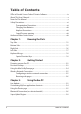 About This User’s Manual You are reading the Eee PC User’s Manual. This User’s Manual provides information regarding the various components in the Eee PC and how to use them. The following are major sections of this User’s Manual: 1. Knowing the Parts Provides information on the Eee PC’s components. 2. Getting Started Provides information on getting started with the Eee PC. 3. Using the Eee PC Provides information on using the Eee PC’s utilities. 4.