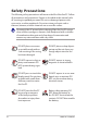 Safety Precautions The following safety precautions will increase the life of the Eee PC. Follow all precautions and instructions. Except as described in this manual, refer all servicing to qualified personnel. Do not use damaged power cords, accessories, or other peripherals. Do not use strong solvents such as thinners, benzene, or other chemicals on or near the surface. Disconnect the AC power before cleaning.